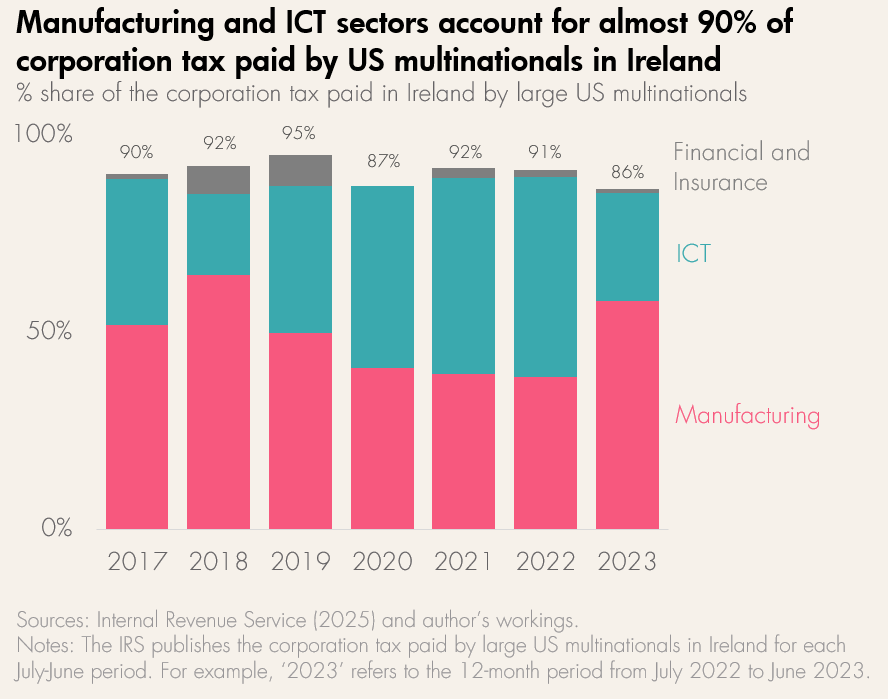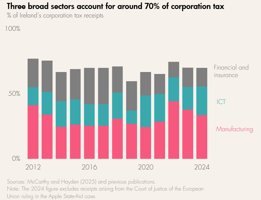 Since 2012, official data published by the Revenue Commissioners shows that about 70% of Ireland’s corporation tax revenues have come from just three broad sectors: manufacturing, information and communication (ICT), and financial and insurance activities.