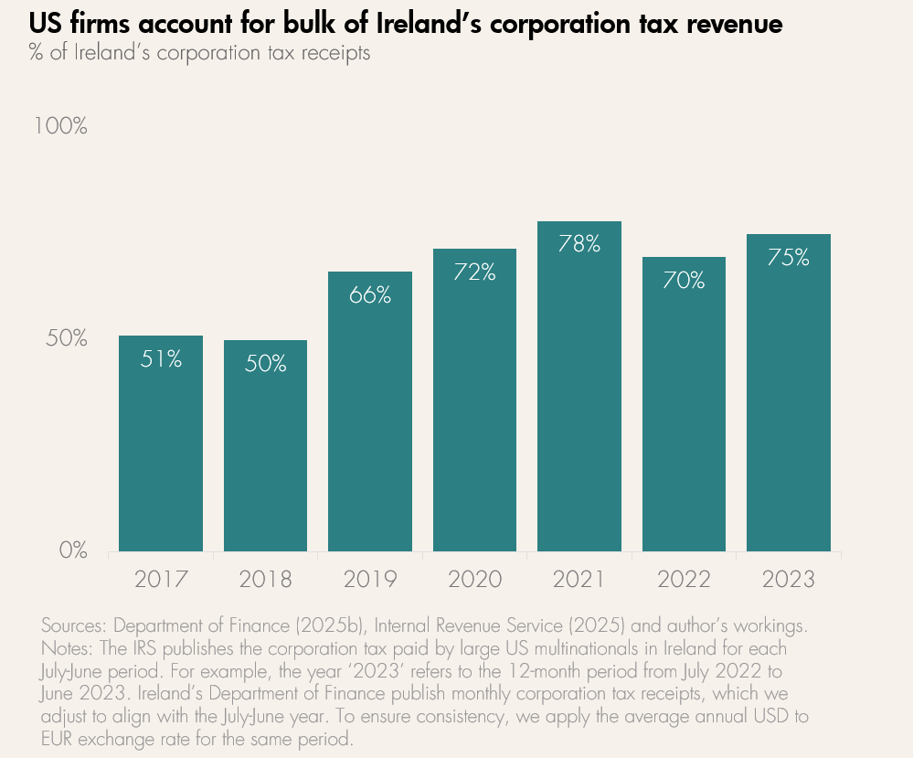 US multinationals are the biggest corporation taxpayers in Ireland. Cronin (2025) estimates that they account for around three-quarters of all corporation tax revenues (Figure 2). These receipts are linked to significant levels of economic activity. US multinationals directly employ around 220,000 people in Ireland, with thousands more jobs reliant on their presence here (Department of Finance, 2025). The US is also Ireland’s single biggest bilateral trading partner, accounting for nearly one-fifth of all Ireland’s goods and services exports in 2023.